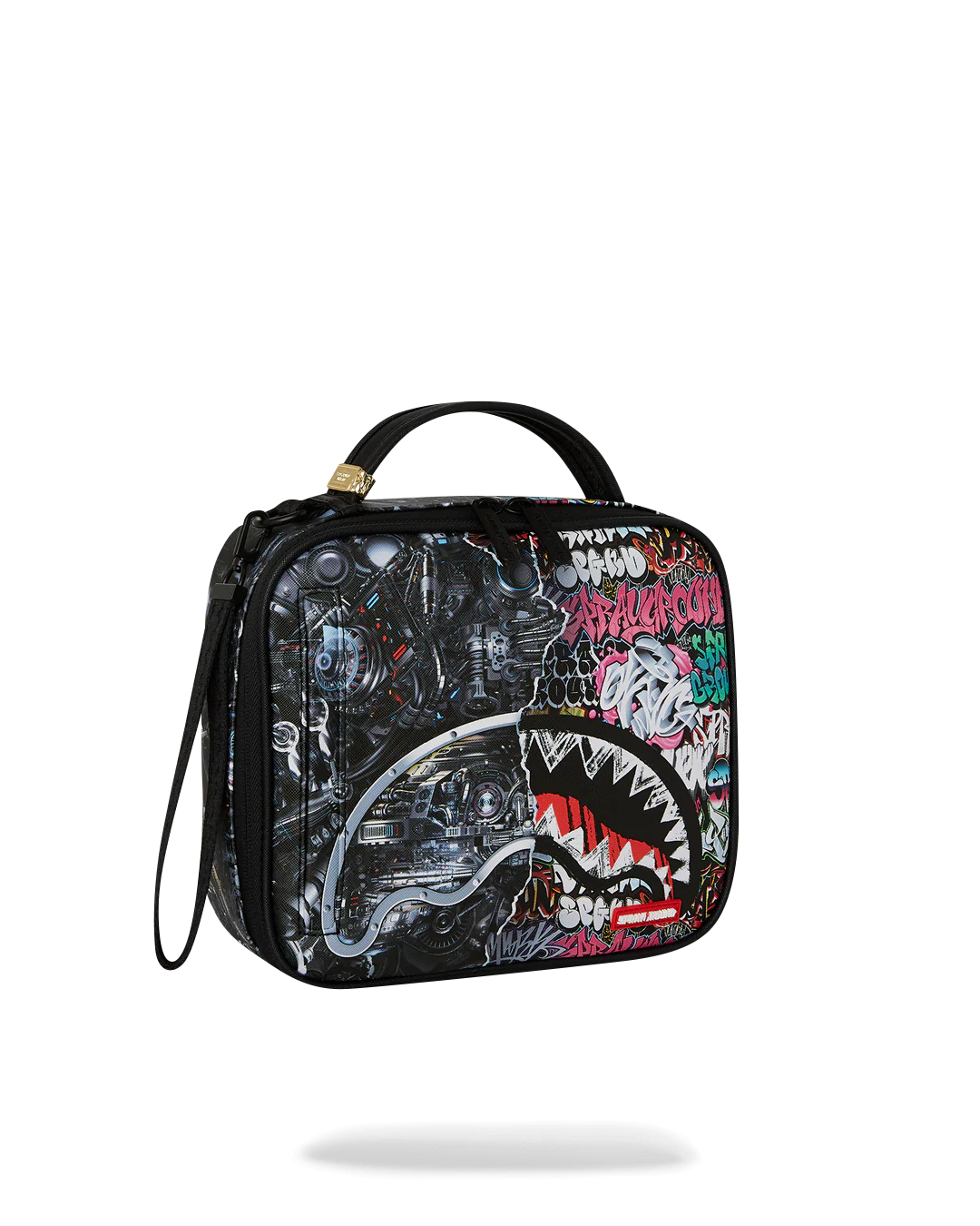Dimensions: 8.5″ x 3″ x 8.5″ • Double zipper opening • Top handle • Removable side handle • Red zippers with metal hardware • Zippered stash pocket