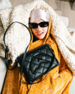 100% PVC quilted black faux leather featuring black chain hardware and hanging charm logo.